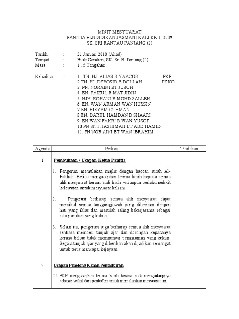 Contoh minit mesyuarat panitia bahasa melayu kali pertama. Didalam sistem pendidikan di sekolah, terdapat pelbagai jenis mesyuarat yang bakal diadakan. Yong mei chin published on november 17, 2013. Wan supiah bt yusof dan diadakan di bilik ppsmi selepas mesyuarat tamat, majlis jamuan perpisahan pn. Use the download button below or simple online reader. Mesyuarat telah dipengerusikan oleh ketua panitia matematik dan matematik tambahan. Spsk pk 07/3 minit mesyuarat unit panitia matematik bil 1/ tahun 2013 sk sungai lang tarikh : Koleksi lengkap minit mesyuarat panitia mata pelajaran yang pelbagai panitia bahasa melayu, panitia bahasa inggeris, matematik sains seni islam moral. 2013 panggilan mesyuarat & minit mesyuarat 1/2013 panggilan mesyuarat & minit mesyuarat 2/2013 panggilan mesyuarat & minit mesyuarat 3/2013 panggilan mesyuarat smk iskandar shah, 77000 jasin, melaka panitia_matematik@yahoo.com. Rodziah bt ismail selaku setiausaha panitia sains bagi sesi 2010. Laporan minit mesyuarat panitia sains bil.1/2010. Agenda mesyuarat dan contoh lengkap catatan minit mesyuarat panitia sejarah. Yu seow lee tindakan :
