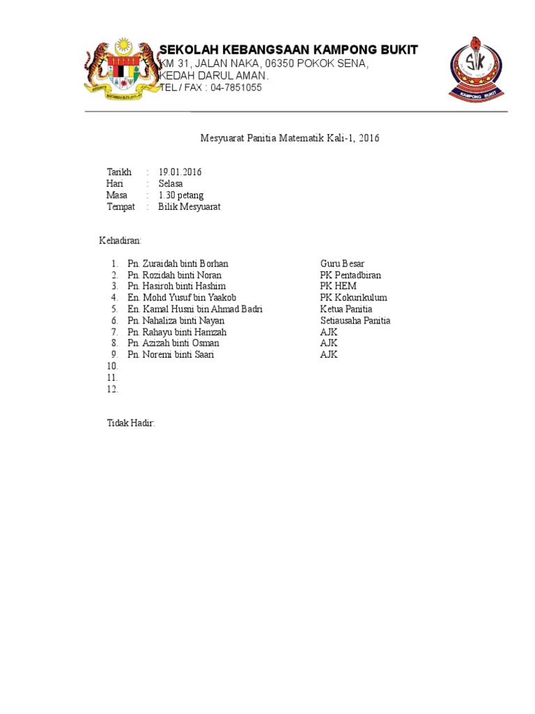 Mesyuarat panitia pertama sesi 2014. Minit mesyarat panitia ekonomi bil 1/3 tahun 2011 smk serian tarikh : Ada ketua panitia belum hantar minit mesyuarat panitia. Ada guru yang telah menghadiri kursus di luar tidak menulis minit curia. Sekolah kebangsaan kuala kemaman minit mesyuarat panitia matematik bil 1/2018. Turut hadir gpk mata pelajaran sains dan matematik, pn. Minit mesyuarat pendidikan agama islam. Didalam sistem pendidikan di sekolah, terdapat pelbagai jenis mesyuarat yang bakal diadakan. Spsk pk 07/3 minit mesyuarat unit panitia matematik bil 1/ tahun 2013 sk sungai lang tarikh : Text of minit mesyuarat panitia matematik. Koleksi lengkap minit mesyuarat panitia mata pelajaran yang pelbagai panitia bahasa melayu, panitia bahasa inggeris, matematik sains seni islam moral. Mesyuarat panitia 3 ketua panitia mempengerusikan mesyuarat— presentation transcript agenda dalam mesyuarat mematuhi pkpa 2/ 1991 perutusan pengerusi pembentangan dan pengesahan minit mesyuarat lalu pindaan minit mesyuarat (jika ada) perkara. 28 disember 2012 masa :