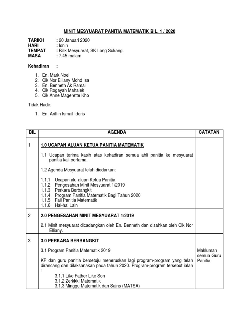 Mesyuarat telah dipengerusikan oleh ketua panitia matematik dan matematik tambahan. Contoh minit mesyuarat panitia bahasa melayu kali pertama. 28 disember 2012 masa : Text of minit mesyuarat panitia matematik. Minit mesyarat panitia ekonomi bil 1/3 tahun 2011 smk serian tarikh :