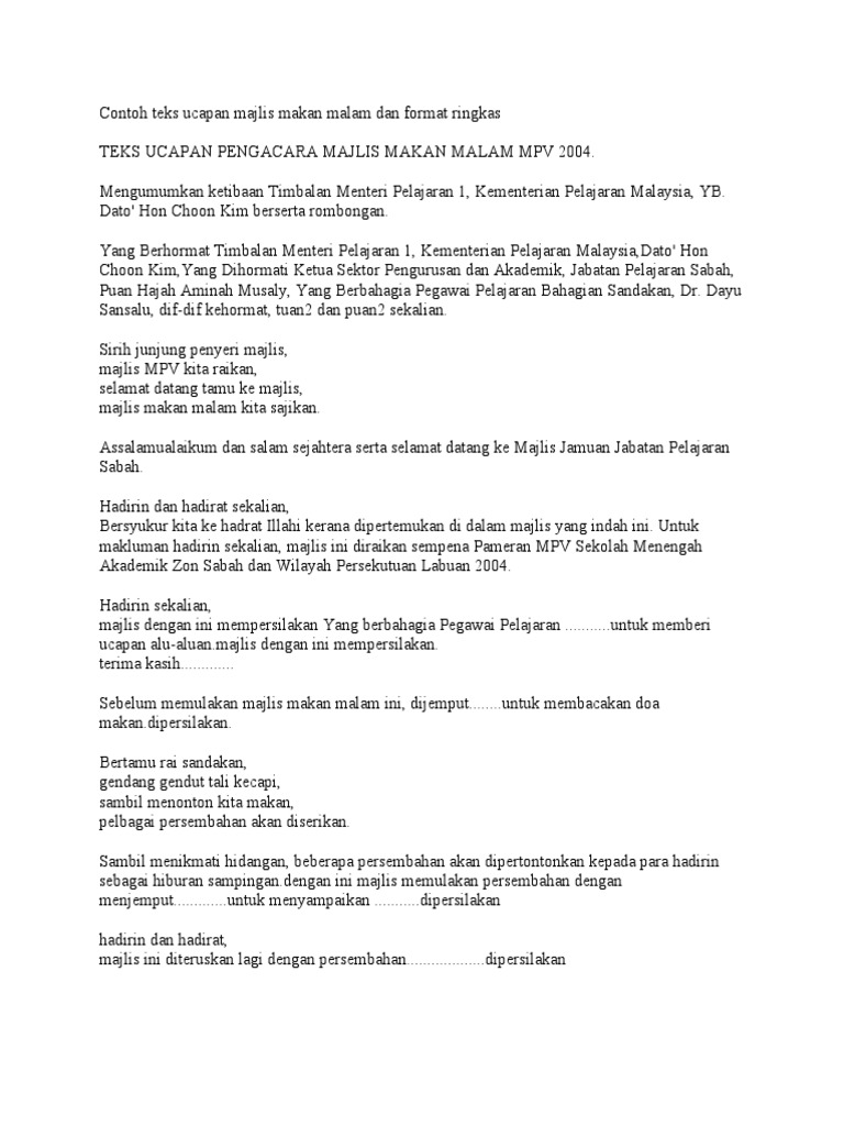 Masuk ke perkarangan majlis, para hadirin diminta untuk berdiri. Majlis perpisahan persaraan saya dengan rasminya telah dibuat oleh pihak sekolah menengah kebangsaan sultan ibrahin satu, 17000 pasir mas, kelantan pada 28 februari, 2013 ( khamis ), bertempat di dewan besar sekolah yang bermula pada jam 12.00 tengah hari hingga jam 2.00 petang. Ucapan perasmian adun batang kali. Contoh teks ucapan pengacara majlis. Teks ucapandatuk haji hajiji haji noor,menteri kerajaan tempatan dan perumahan sempena meraikan majlisperpisahan puan p.s. Assalamualaikum wbt wrt, selamat sejahtera dan salam 1malaysia. Pihak majlis mengucapkan terima kasih diatas ucapan yang disampaikan sebentar tadi. Berikut adalah teks ucapan pengacara majlis bagi mesyuarat agung tahunan bakerp kali ke sembilan yang diadakan pada 23 jun 2011. Kini tibalah masa , untuk kita mendengar amanat dan ucapan yang. Teks majlis kuarter master teks ucapan majlis kuarter master. Semoga segala amanat yang disampaikan sentiasa tersemat di jiwa, berlegar di minda. Seterusnya, majlis menjemput en saupi, merangkap sebagai timbalan ketua pegawai eksekutif syarikat untuk mengiringi en muhammad yusri naik ke atas pentas untuk menyempurnakan acara perasmian majlis makan malam. Teks ucapan majlis perpisahan 1.