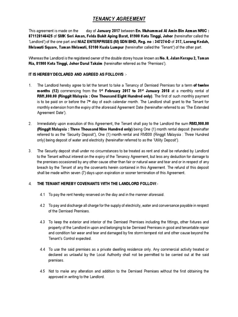Some document may have the forms filled, you have to erase it manually. Landlords and tenants can't avoid their obligations by not putting their agreement in. Often many cases property rental agents would be helping landlords if you get a lawyer to draft for a standard residential tenancy agreement, they might charge you from rm200 to rm400, depending on the rental rates. Malaysian tenancy contracts are usually set for a term of 1 year and require several deposits. We`ve added a side column to explain what each clause means easier. If the landlord terminates the tenancy agreement prematurely, the landlord must repay the deposit plus an additional rent of two months. In malaysia, there is no single act that governs the matters relating to rental and tenancy. Either the tenant or landlord can engage a lawyer to draft the tenancy agreement. In malaysia, this requires the title. Extension agreement and renewal agreement in malaysia is same in meaning? Who pays tenancy agreement charges? However, due to the legal language that is used in the drafting of a tenancy. Name and description of the landlord.